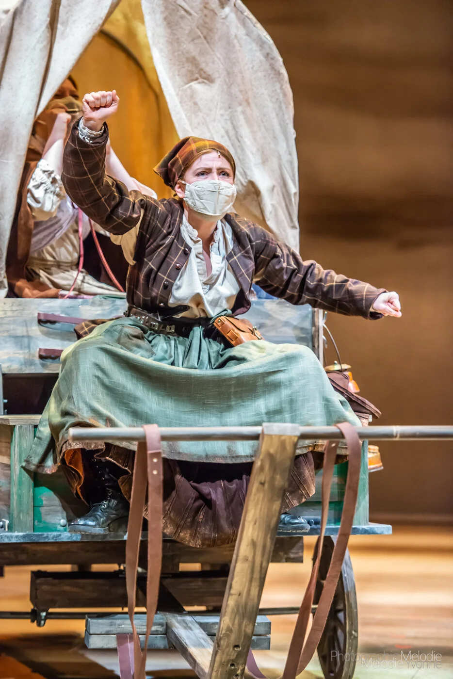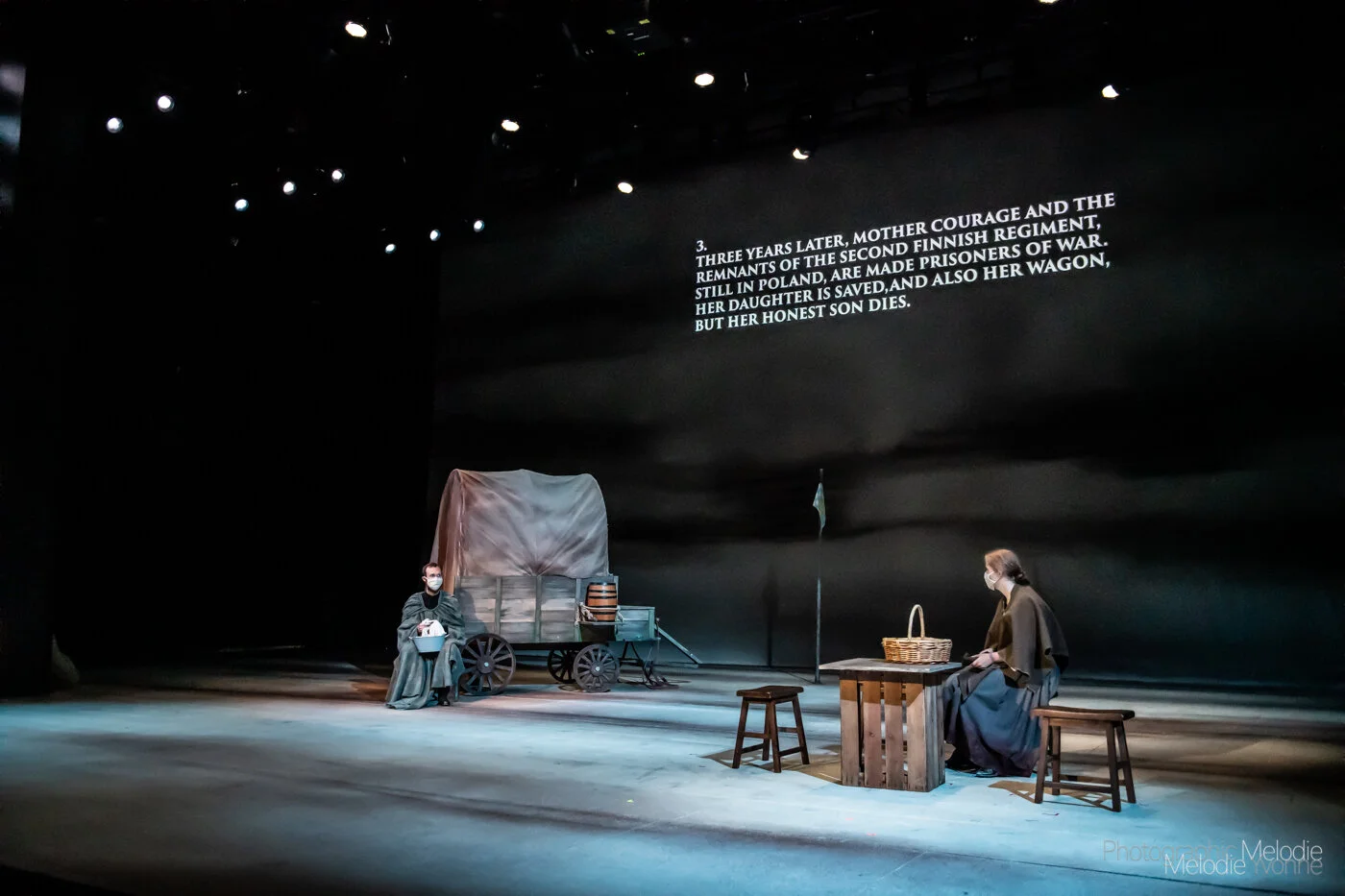 Beyond this theoretical/aesthetic description, the contrasting styles and the forward momentum of the timeline echo the sense that the more things change in Mother Courage, the clearer it becomes that the core of the issues remains constant. The machine of capitalism that makes the world starker, the horror and chaos brought by war, and the murkiness of the path forward. The simplicity of the former and the chaos of the latter are ultimately two sides of the same coin.
